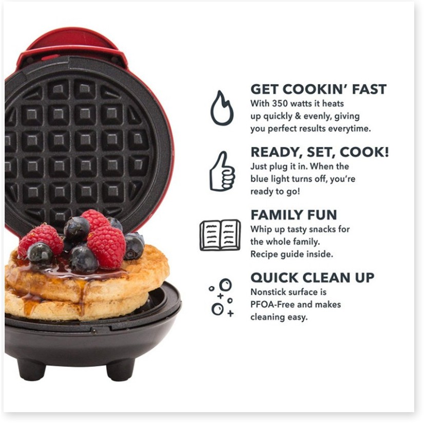 Nhanh + Dễ dàng: Đơn giản chỉ cần cắm vào và sử dụng; sản phẩm làm nóng chỉ trong vài phút. Các bề mặt chống dính kép giúp cho bánh chín đều mọi mặt