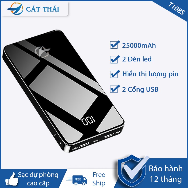 Pin sạc dự phòng T108S 25000mAh Dung lượng lớn Sạc nhanh 2 cổng USB kèm 2 đèn pin tặng kèm dây