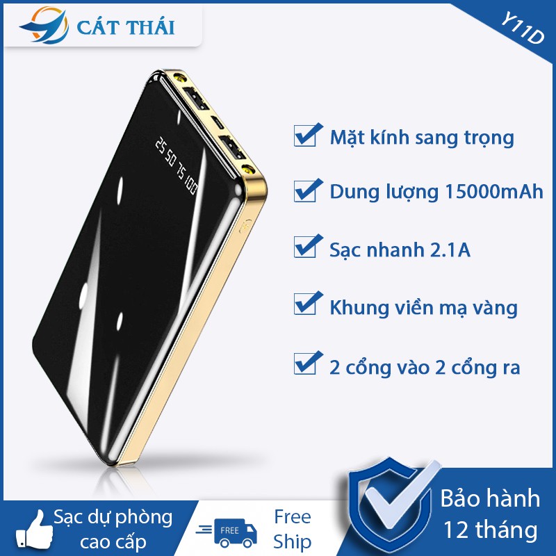 [Tặng dây sạc] Pin sạc dự phòng,Sạc dự phòng 15000mAh Cát Thái Y11D mặt kính sạc nhanh 2.1A nhỏ gọn 2 cổng ra 2 cổng và