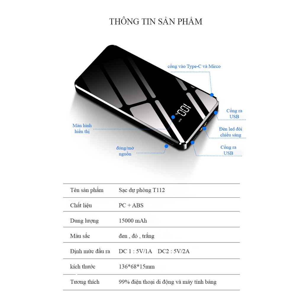 Điện Thoại & Phụ Kiện > Pin sạc dự phòng > 10000 - 20000mAh || [Tặng dây sạc] Pin sạc dự phòng,Sạc dự phòng T112S 15000mAhSạc nhanh 2.1A 2 cổng USB 2 cổng Type-C và Mirco kèm 2 đènCòn hàng