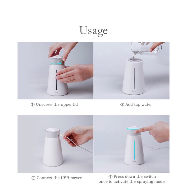 - Máy phun sương, tạo ẩm, lọc không khí Baseus Slim Waist humidifier được tích hợp cổng USB có thể dùng với quạt và đèn mini USB đi kèm .