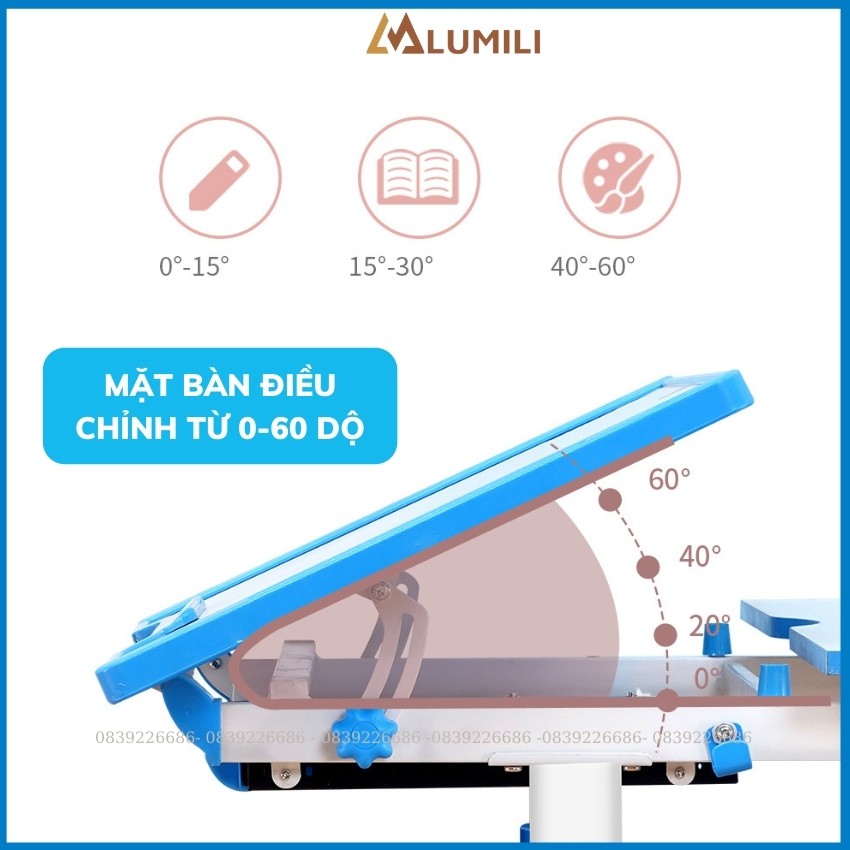 ✔ Chống cận thị, gù lưng do mặt bàn điều chỉnh góc nghiêng từ 0 đến 60 độ, tối ưu khoảng cách từ mắt trẻ tới mặt bàn. Bàn ghế có thể nâng lên hạ xuống, điều chỉnh nhiều góc độ khác nhau.