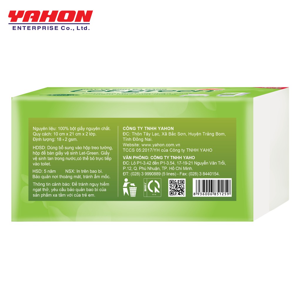 Thương hiệu giấy Let-green là một trong những thương hiệu uý tín được sản xuất và phân phối bởi Công ty TNHH YAHON, 100% vốn Đài Loan. Chúng tôi có kinh nghiệm trên 20 năm trong việc sản xuất và kinh doanh các mặt hàng tiêu dùng nhanh bao gồm các loại: khăn ướt, bông tẩy trang, khăn giấy, quần miễn giặt và vật tư y tế. Với đội ngũ công nhân viên gần 1000 người, chúng tôi luôn nỗ lực nghiên cứu và sản xuất các sản phẩm chất lượng cao, phục vụ người dùng khắp Việt Nam và Quốc Tế.