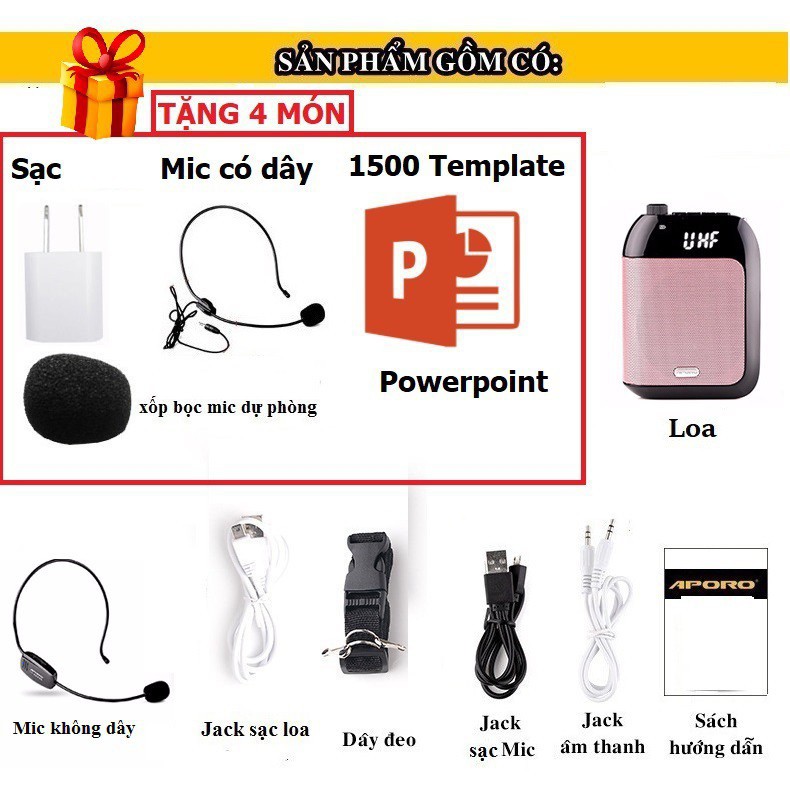 Bộ sản phẩm gồm có : 1 mic không dây 2.4G quàng đầu, , 1 mic có dây quàng đầu, 1 loa Aporo T9