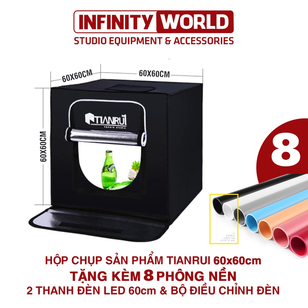 Hộp đèn chụp ảnh sản phẩm chuyên nghiệp TIANRUI 60x60cm (Đã có LED Và DIM điều chỉnh độ sáng)==> Toàn bộ sản phẩm đã bao gồm Hộp đèn và 2 thanh Led Tản nhôm chính hãng Tianrui (Có bao gồm DIM điều chỉnh độ sáng) - Ngoài ra còn được tặng kèm 8 phông nền (4 phông PVC THEO SIZE HỘP và 4 phông nền VẢI KHÔNG DỆT) Và một số quà tặng ngẫu nhiên khác