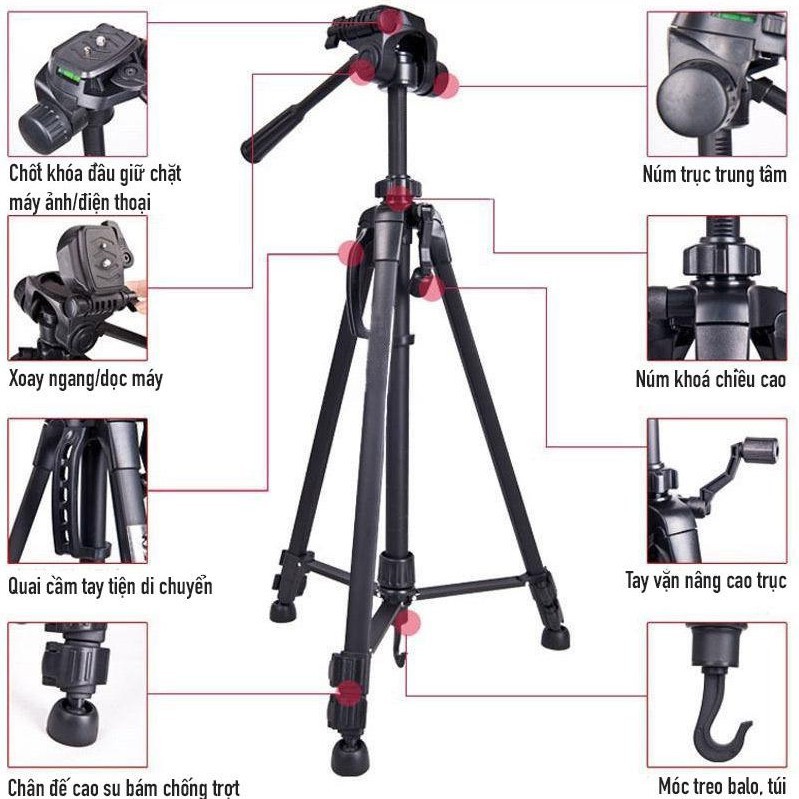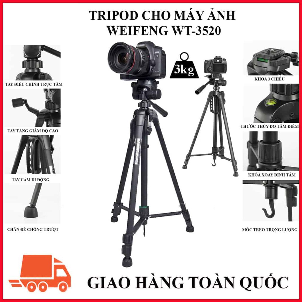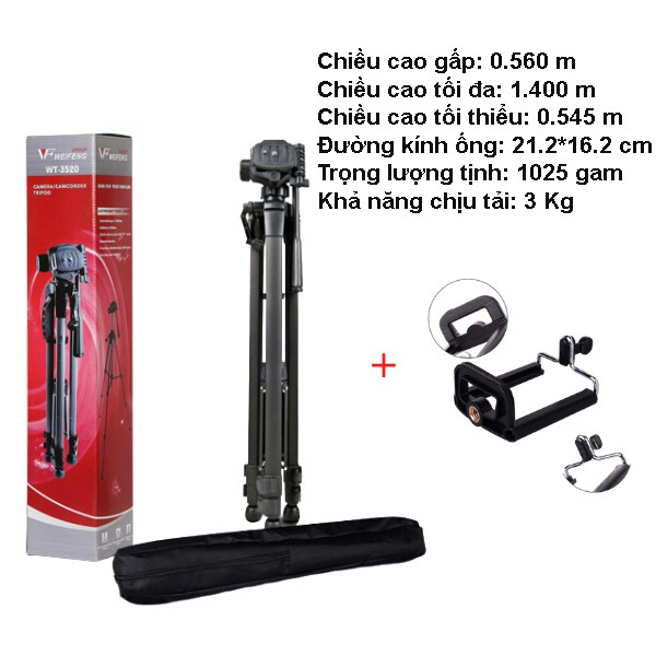 Tripod chân máy ảnh Weifeng WT-3520, khung nhôm cao cấp, cao 1.4m chịu tải 3kg hỗ trợ chụp hình, quay video, livestream có quai cầm tay, móc treo và túi đeo.- Tripod Máy Ảnh Weifeng WT-3520 được thiết kế dành riêng cho những chiếc máy ảnh, máy quay phim gia đình với kích thước gọn nhẹ, dễ di chuyển, dễ sử dụng. Không chỉ giúp chụp ảnh dễ dàng, giảm tình trạng mờ nhòe do rung tay, chân máy ảnh WT-3520 còn đem lại cho bạn sự linh động để thoải mái sáng tạo những khung hình đẹp.