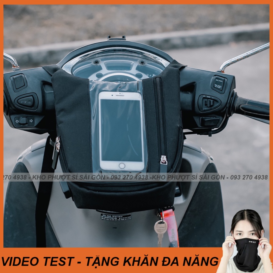 Tặng kèm khăn ống đa năng đen trơn với Túi treo đầu xe máy dạng dọc đứng ngang đựng điện thoại cảm ứng