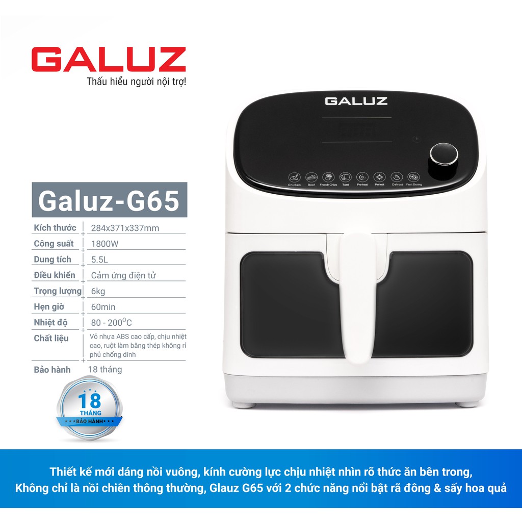 Giới thiệu (Tặng nồi cơm Galuz) Nồi chiên không dầu điện tử GALUZ G-65 (G65) dung tích 5,5L, công suất 1800W, bảo hành 30 tháng