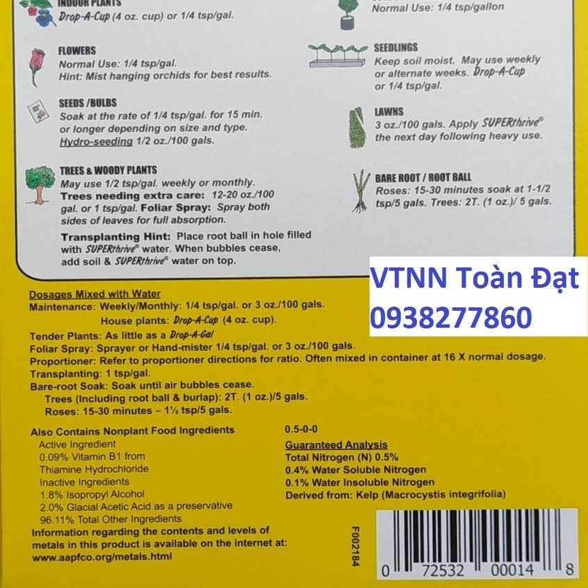 SuperThrive Có thành phần là các chất vitamins và các hormon thực vật kích thích tăng trưởng cho cây trồng