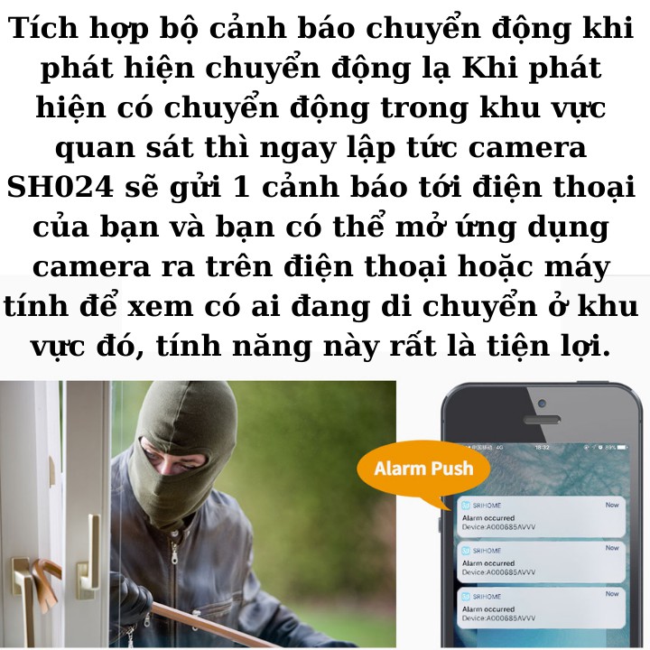 - Khi phát hiện có chuyển động trong khu vực quan sát thì ngay lập tức camera SH024 sẽ gửi 1 cảnh báo tới điện thoại cuả bạn và bạn có thể mở ứng dụng camera ra trên điện thoại hoặc máy tính để xem có ai đang di chuyển ở khu vực đó, tính năng rất là tiện lợi