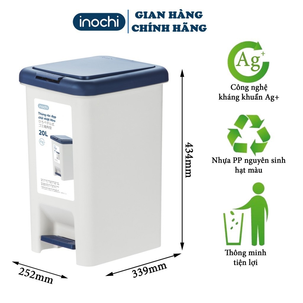 Giới thiệu Thùng rác INOCHI Hiro nhựa 20L (kèm ruột) chữ nhật, đạp chân, nắp bấm, có nắp đậy, chống mùi hôi