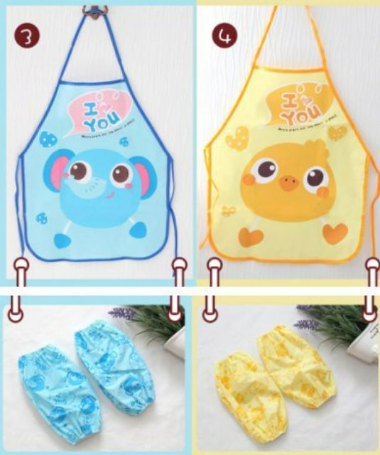 Tạp dề cho bé phụ mẹ việc nhàChất liệu: nhựa pp mềm, chống thấm tốt. Gồm tạp dề và 2 lót tay chống nước.