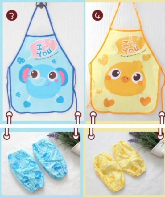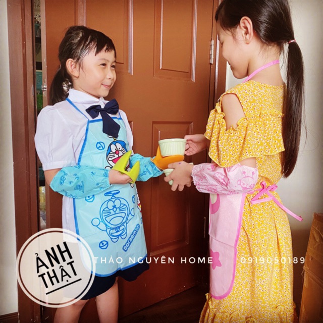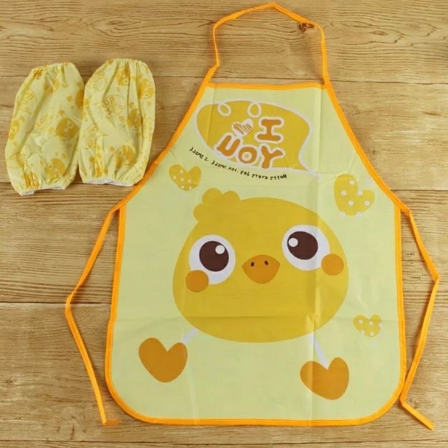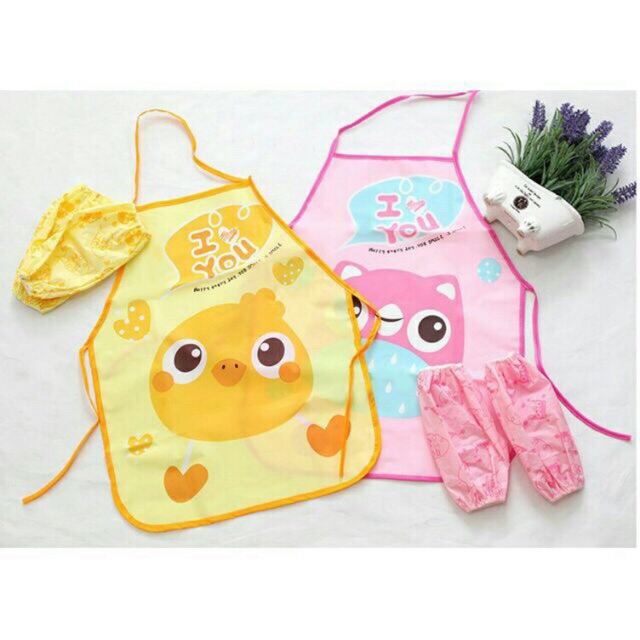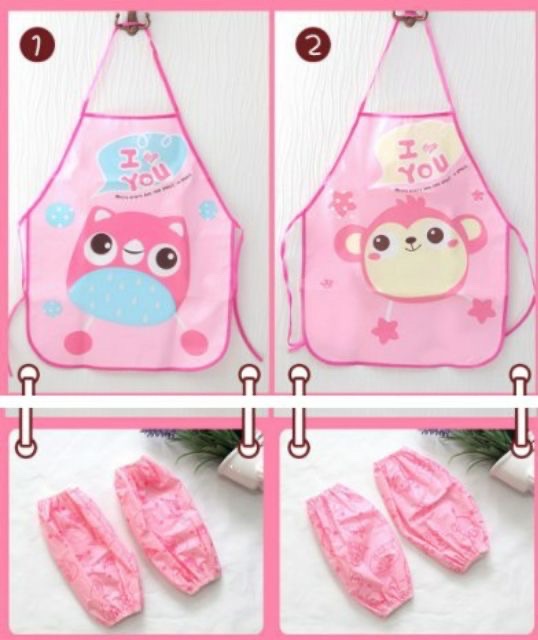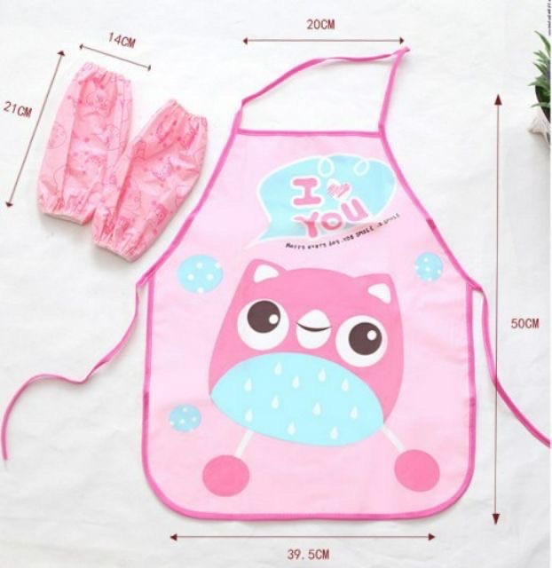 Có 2 bao cổ tay và 1 tạp dề, chất liệu chống thấm, họa tiết xinh yêu