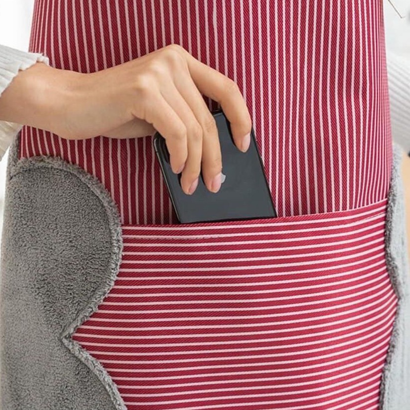 - 2 bên sườn có gắn 2 miếng vải thấm hút nước tốt để lau tay sau khi rửa rau, rửa bát