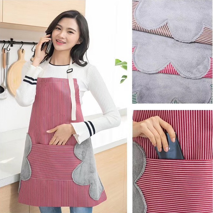 - Tạp dề chống thấm nước, thấm dầu có thiết kế khăn lău hai bên eo vô cùng tiện lợi. Chất liệu nhung san hô mềm mại có khả năng thấm hút tốt và mềm dịu với da tay của bạn.