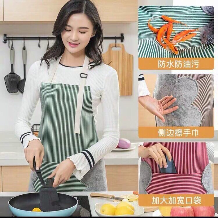 - Tạp Dề Chống Thấm với thiết kế thông minh khi được may kèm vải bông 2 bên hông giúp bạn lau tay nhanh chóng và sạch sẽ khi nấu ăn. Bên cạnh đó chiếc tạp dề này còn thiết kế cho bạn chiếc túi to để đựng điện thoại rất tiện lợi.