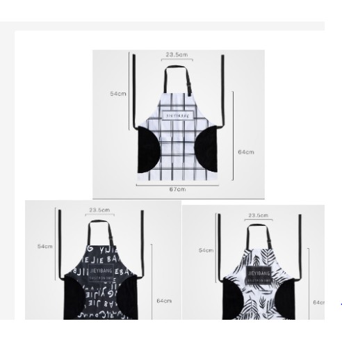 ** Kích thước tạp dề: dây đeo dài 54cm, dây đeo cổ dài 23.5cm, kích thước phần thân tạp dề: 67x64cm
