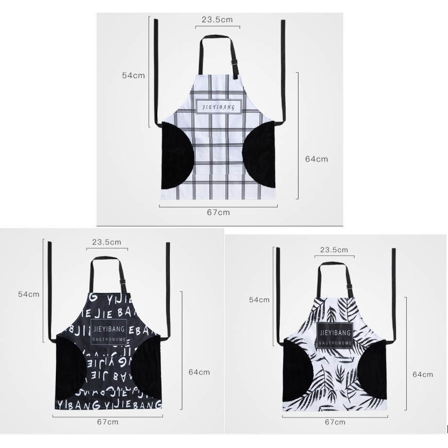 ** Kích thước tạp dề: dây đeo dài 54cm, dây đeo cổ dài 23.5cm, kích thước phần thân tạp dề: 67x64cm