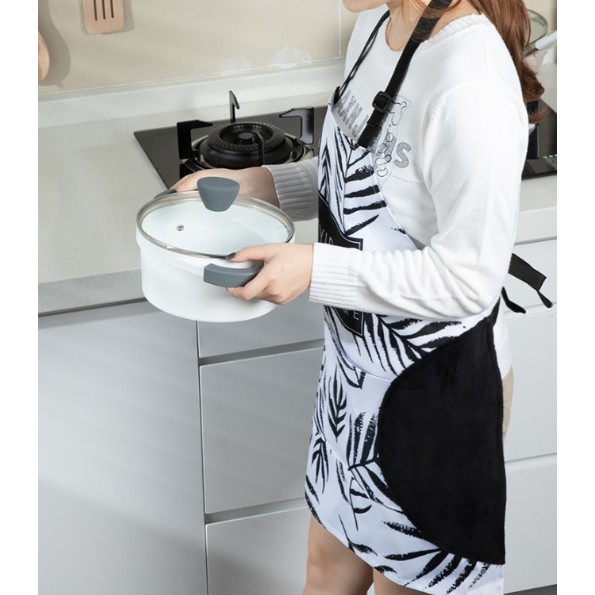 ** Chất liệu: phần thân không thấm nước, riêng hai miếng chùi tay bên hông chất liệu vải san hô thấm hút nhanh.