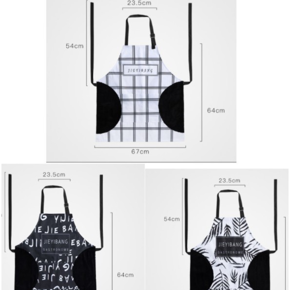 ** Kích thước tạp dề: dây đeo dài 54cm, dây đeo cổ dài 23.5cm, kích thước phần thân tạp dề: 67x64cm