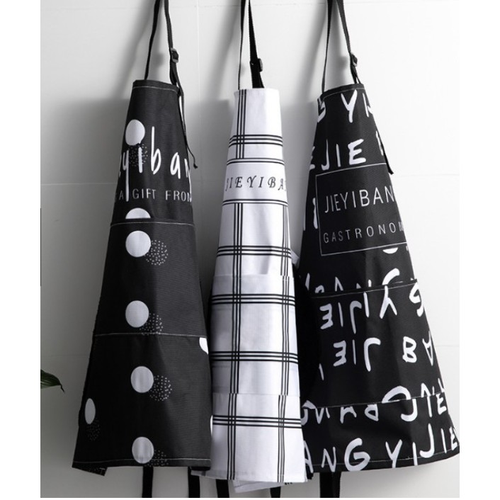 ** Tạp dề chất liệu dày chắc, giúp bạn giữ quần áo sạch sẽ không bị vấy bẩn khi làm bếp** Gồm ba mẫu: CHỮ ĐEN, CHIẾC LÁ ĐEN, Ô CA RÔ
