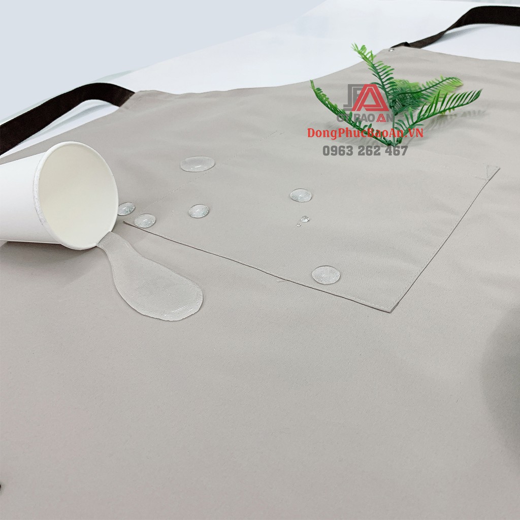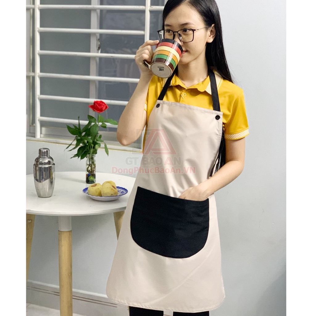 - Tạp dề dài dạng yếm, đeo cổ, có dây cột phía sau, 1 túi phía trước đựng sổ order hoặc các vật dụng hỗ trợ cần thiết. Các đường may kỹ lưỡng, đảm bảo độ bền cao