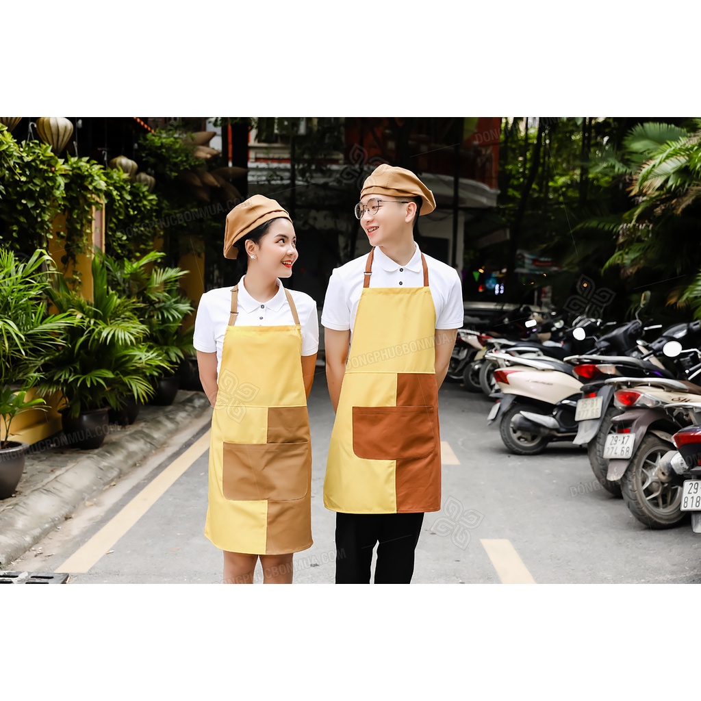 - Tạp dề dài dạng yếm, đeo cổ, có dây cột phía sau, 1 túi phía trước đựng sổ order hoặc các vật dụng hỗ trợ cần thiết. Các đường may kỹ lưỡng, đảm bảo độ bền cao