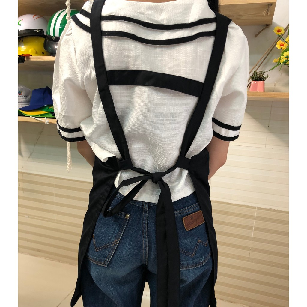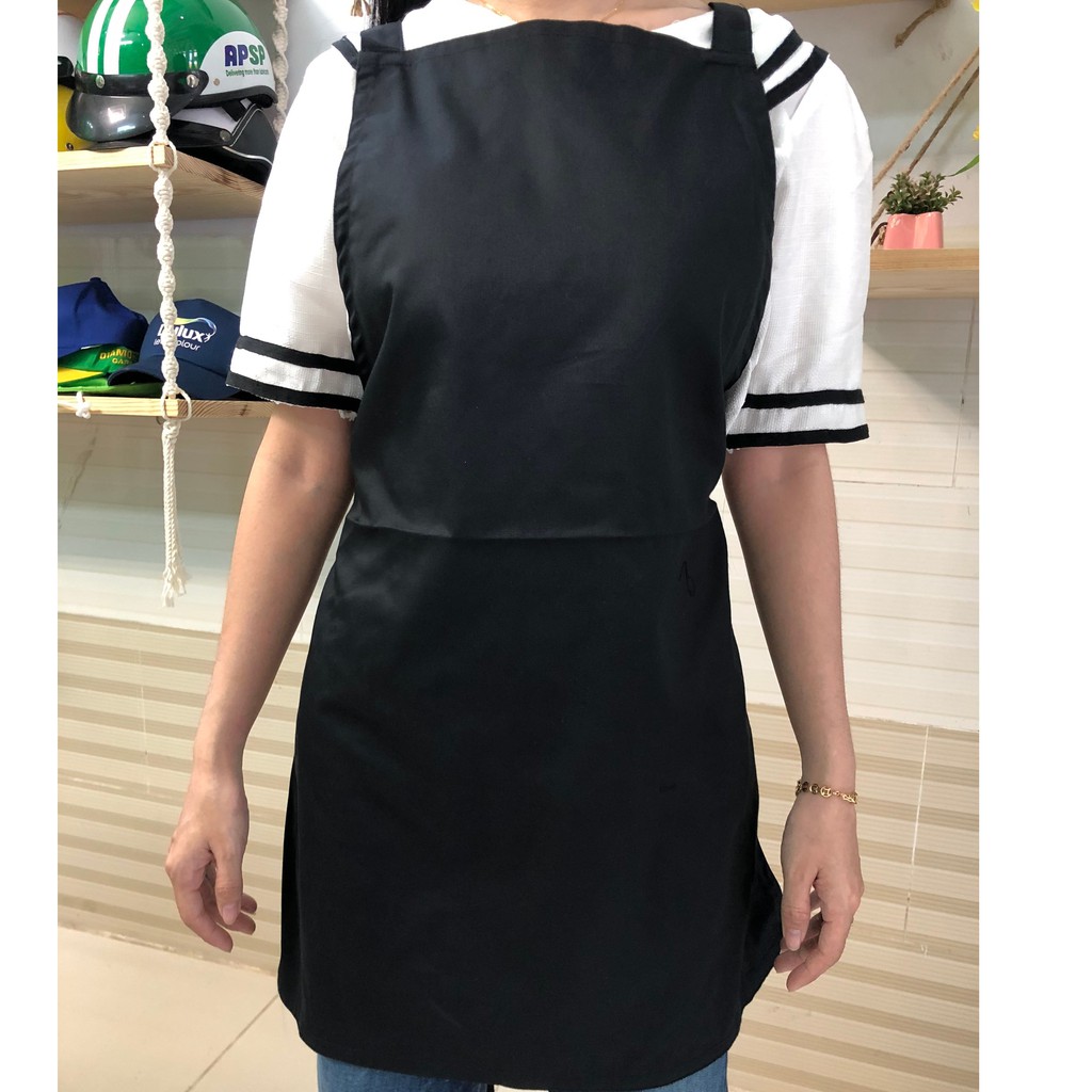o Tạp dề dài dạng yếm, đeo cổ, có dây cột phía sau, 1 túi phía trước đựng sổ order hoặc các vật dụng hỗ trợ cần thiết. Các đường may kỹ lưỡng, đảm bảo độ bền cao
