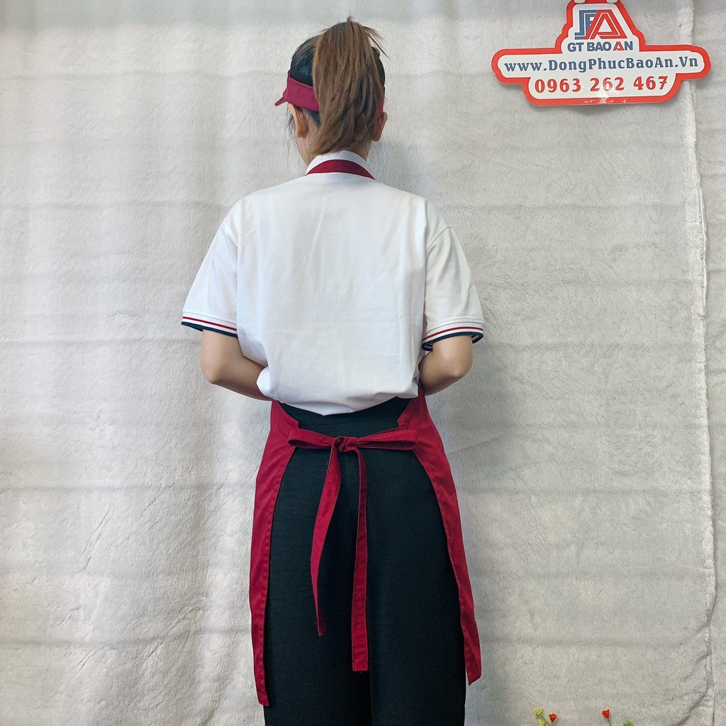 - Quy cách: Tạp dề dài dạng yếm, đeo cổ, có dây cột phía sau, 1 túi phía trước đựng sổ order hoặc các vật dụng hỗ trợ cần thiết. Các đường may kỹ lưỡng, đảm bảo độ bền cao