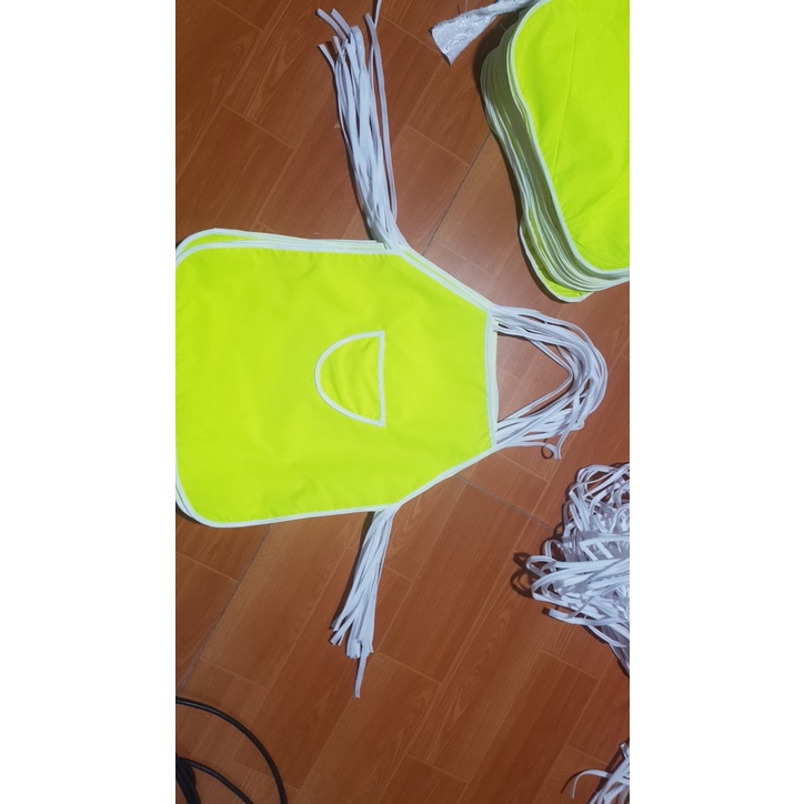 Bộ tạp dề được may 2 lớp: lớp bên ngoài là lớp vải may áo gió dày dặn, lớp bên trong là lớp áo mưa để không bị ướt áo