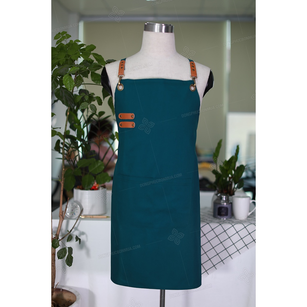 Tạp dề hàng thiết kế cao cấp - Màu xanh, vải kaki phối da có túi rộng tiện lợi - Cho nhân viên phục vụ nam, nữ