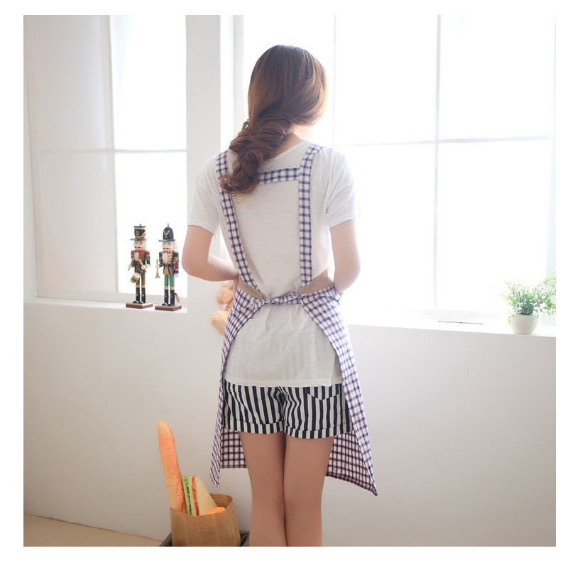 - Thiết kế xinh xắn với sọc caro nổi bật trên nền xanh dương, viền hồng, Tạp dề có tay sẽ mang đến cảm hứng ngập tràn tươi mới cho căn bếp của chị em nội trợ.
