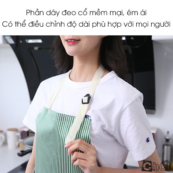 - Tạp dề làm bếp với thiết kế kiểu sọc đơn giản cùng màu sắc tươi sáng vừa giúp bảo vệ quần áo khỏi các vết bẩn vừa góp phần làm đẹp hơn cho chị em trong những phút giây nấu nướng.