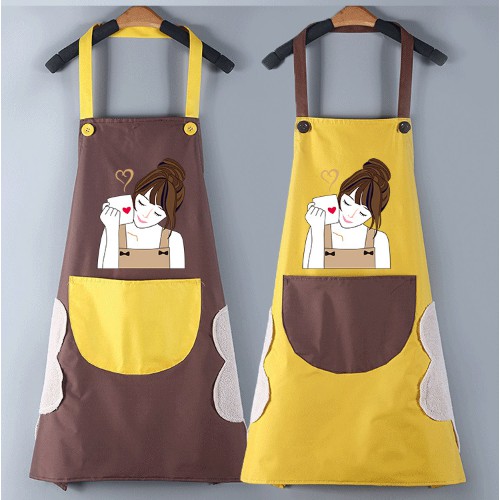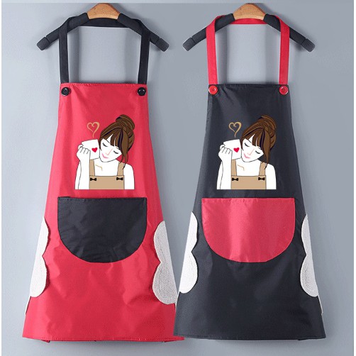 Tạp dề được làm từ chất liệu chống thấm nước, có 2 miếng lau tay bên sườn. Vừa đẹp, vừa tiện lợi.