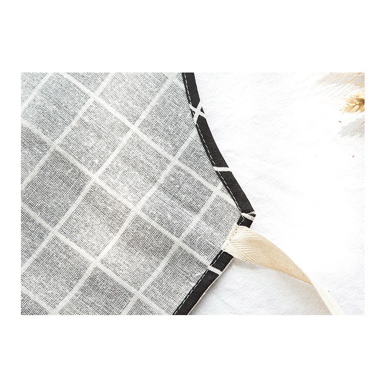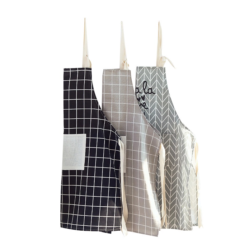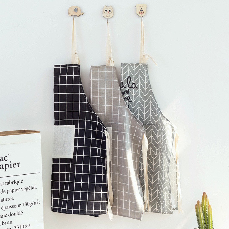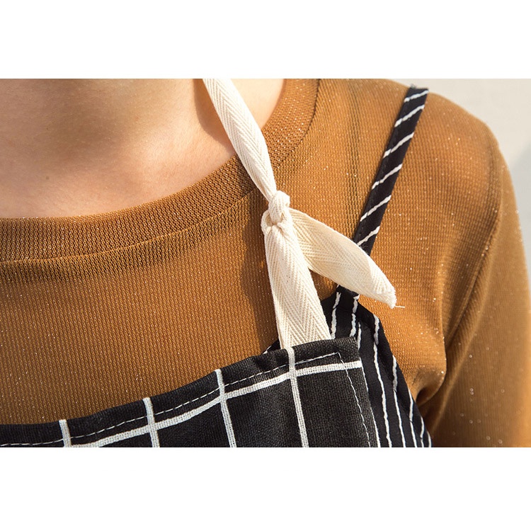 - Tạp dề nấu ăn được làm từ chất liệu vải linen bền đẹp, họa tiết caro nhẹ nhàng, giản dị.