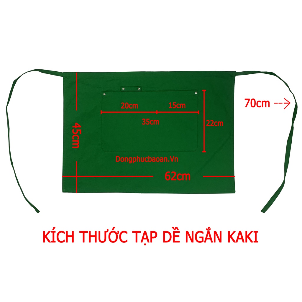 - Quy cách: Tạp dề ngắn, có 2 dây cột sau 70cm, có 2 túi đựng phía trước đựng sổ order hoặc vật dụng cần thiết và có vắt bút