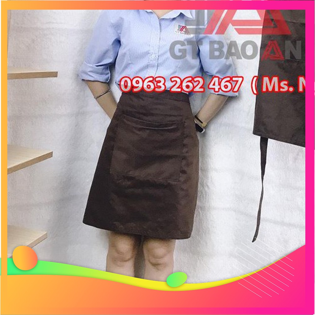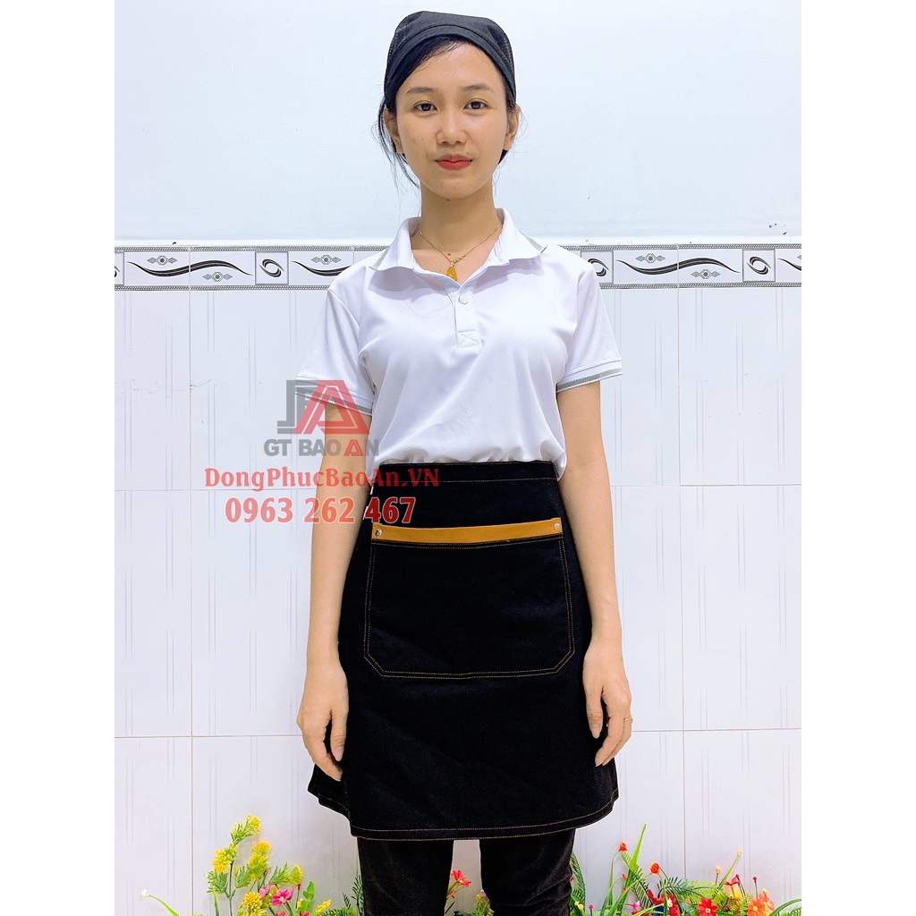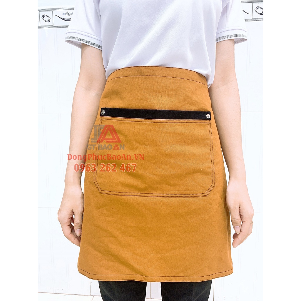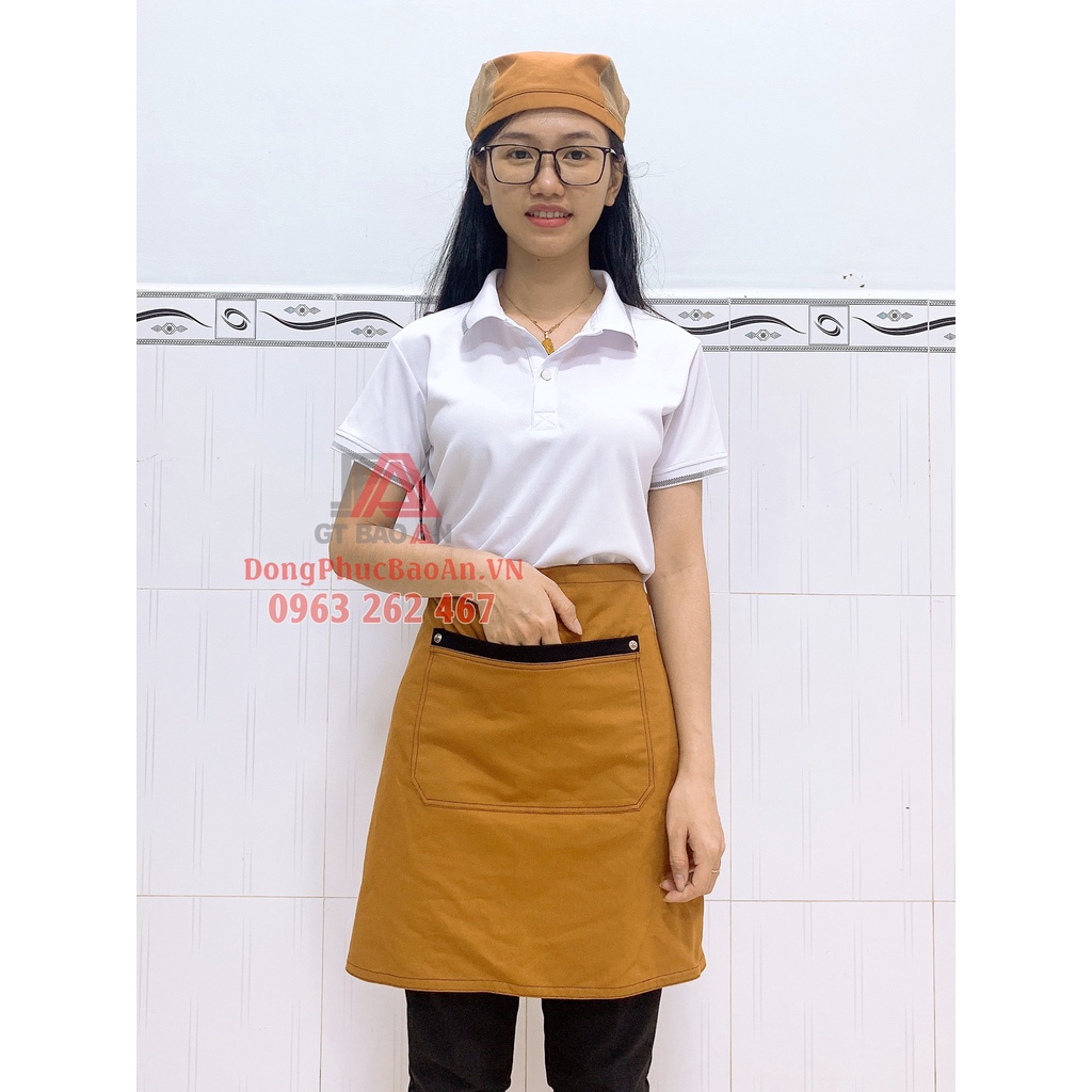 - Quy cách: Tạp dề ngắn, có 2 dây cột sau 63 cm, có 1 túi đựng phía trước đựng sổ order hoặc vật dụng cần thiết