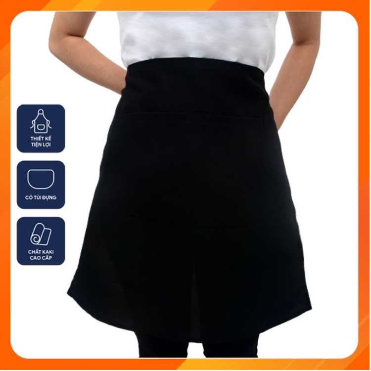 Tạp dề ngắn màu đen trơn chất đẹp - Vải kaki dày dặn, đứng dáng - Thiết kế túi lớn tiện dụng cho nhân viên phục vụ