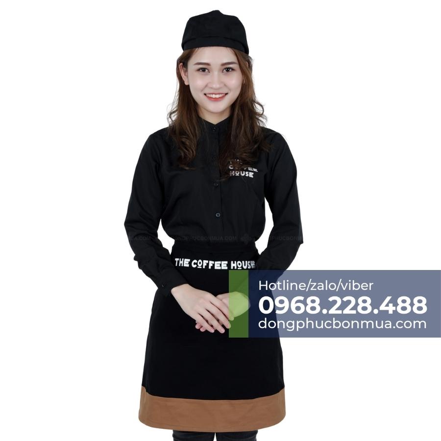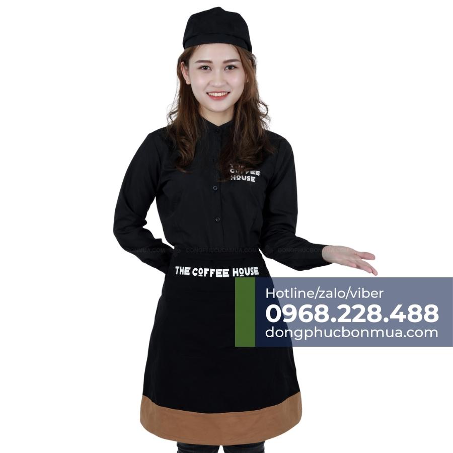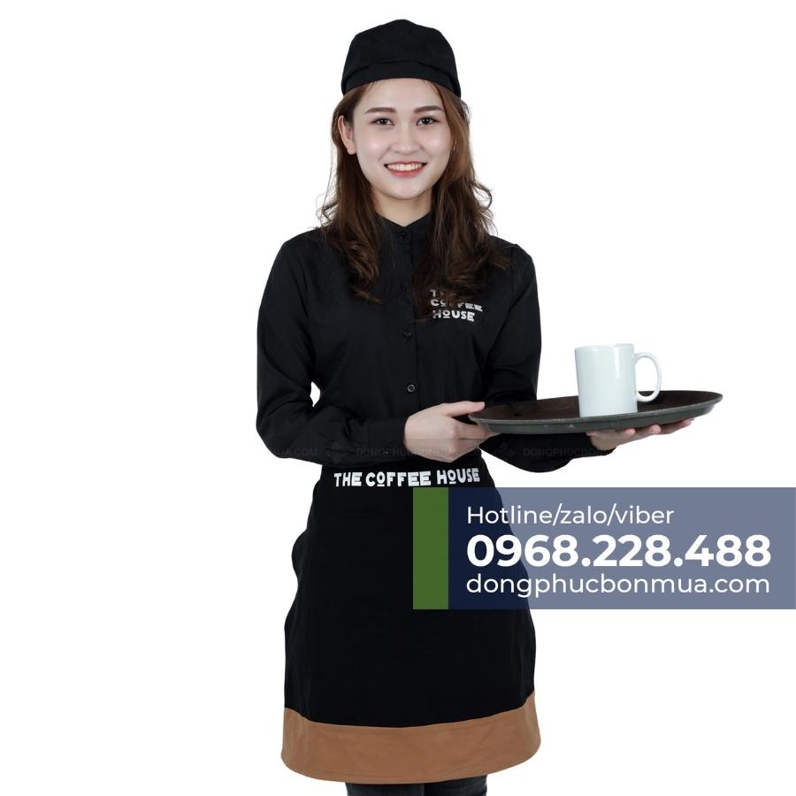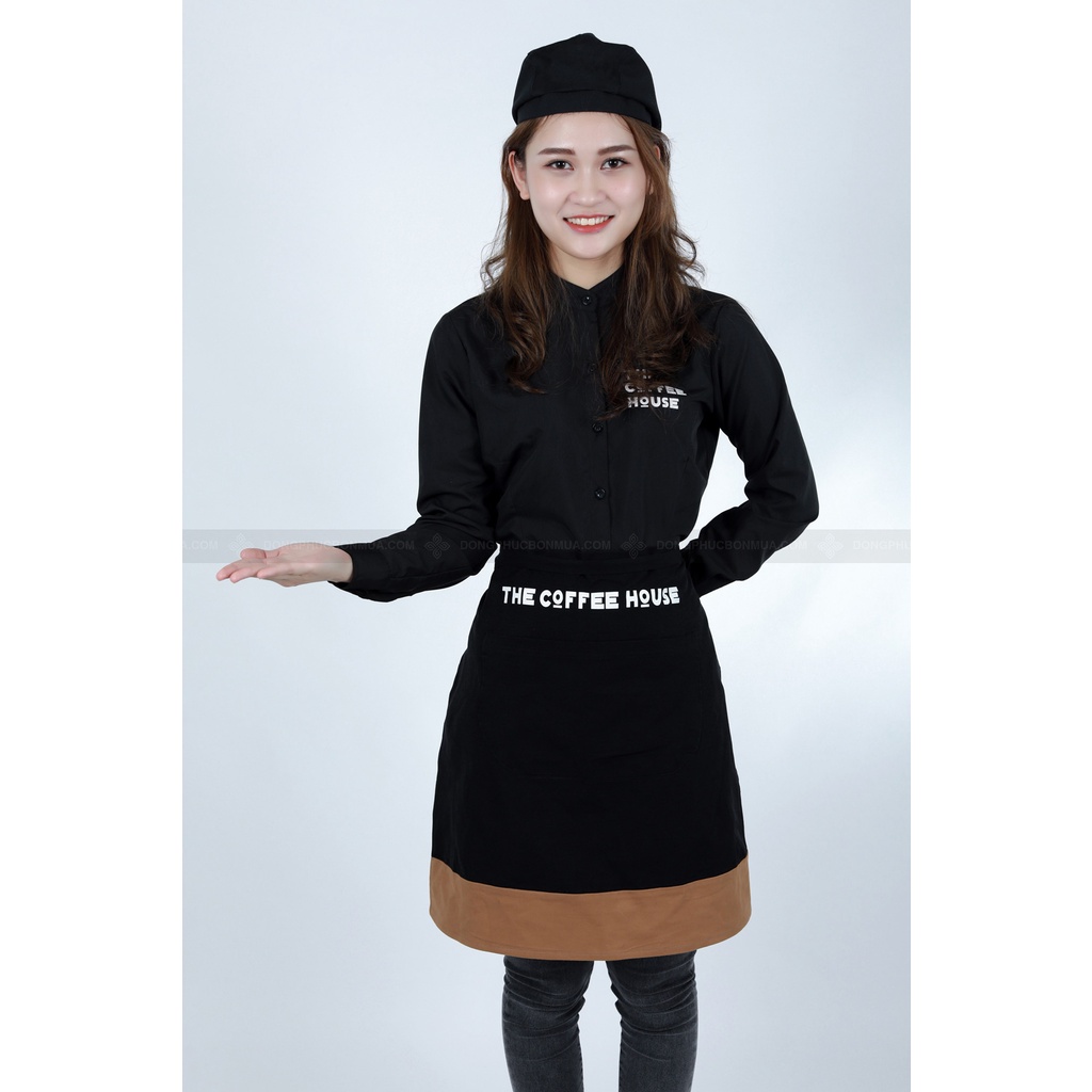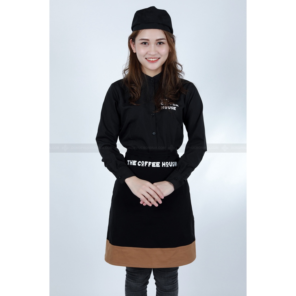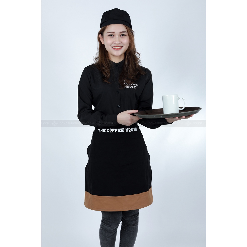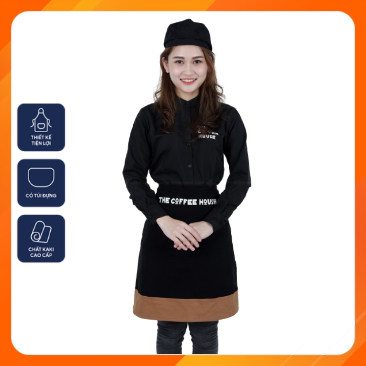 Giới thiệu Tạp dề ngắn phục vụ quán cà phê, nhà hàng - Màu đen trơn phối viền nâu, in chữ - Nhận in tạp dề theo yêu cầu