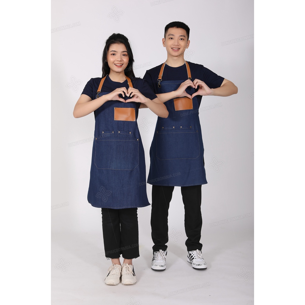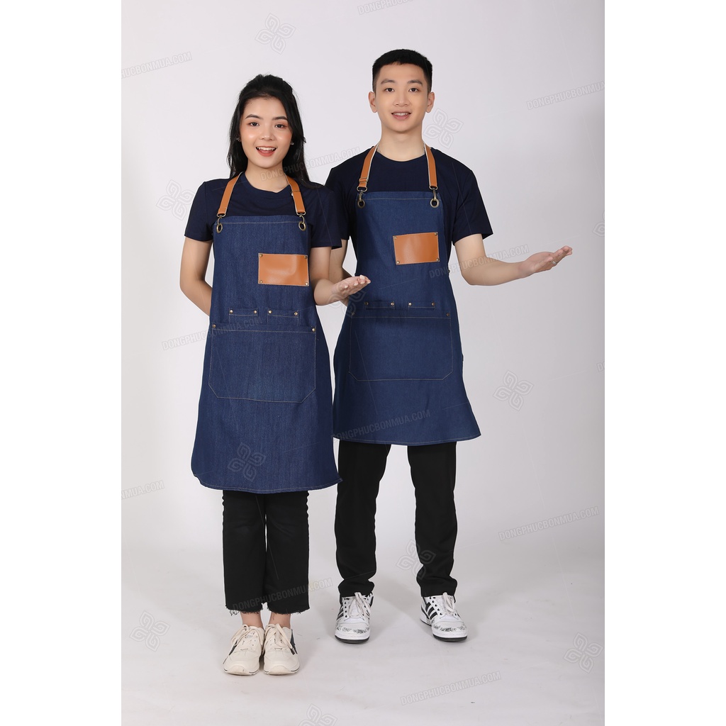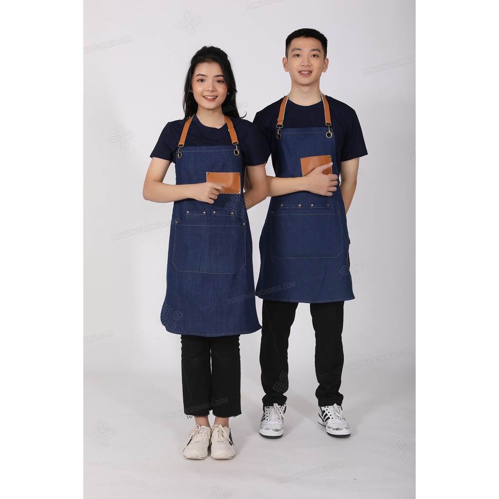 Tạp dề quán café cho nhân viên - Vải denim bền đẹp, phối da cao cấp nhiều túi tiện lợi, dây đeo dài tùy chỉnh kích thước