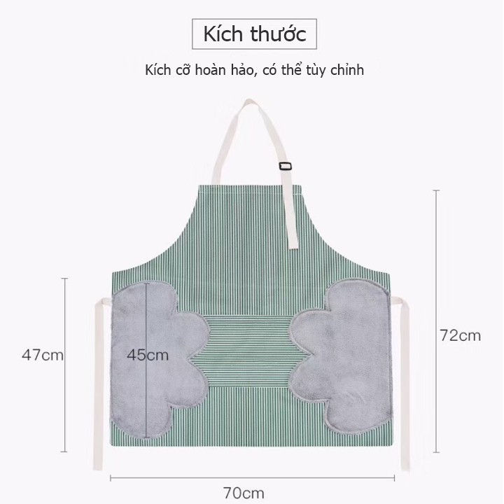 - Tạp dề chống thấm nước, thấm dầu có thiết kế khăn lău hai bên eo vô cùng tiện lợi. Chất liệu nhung san hô mềm mại có khả năng thấm hút tốt và mềm dịu với da tay của bạn.