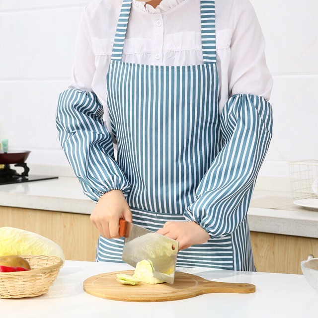 Thiết kế xinh xắn với sọc caro nổi bật trên nền xanh dương, viền hồng, Tạp dề có tay sẽ mang đến cảm hứng ngập tràn tươi mới cho căn bếp của chị em nội trợ.