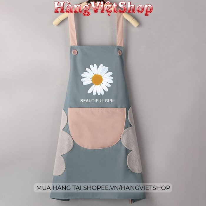 - Tạp dề màu sắc nhã nhặn, trang trí hoa cúc dễ thương và thiết kế tiện dụng khiến cho việc bếp núc trở nên thú vị hơn