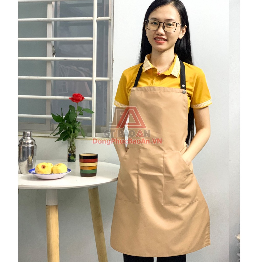 - Tạp dề dài dạng yếm, đeo cổ, có dây cột phía sau, 1 túi phía trước đựng sổ order hoặc các vật dụng hỗ trợ cần thiết. Các đường may kỹ lưỡng, đảm bảo độ bền cao