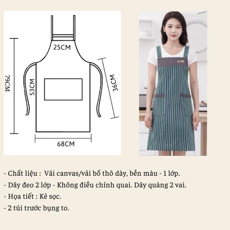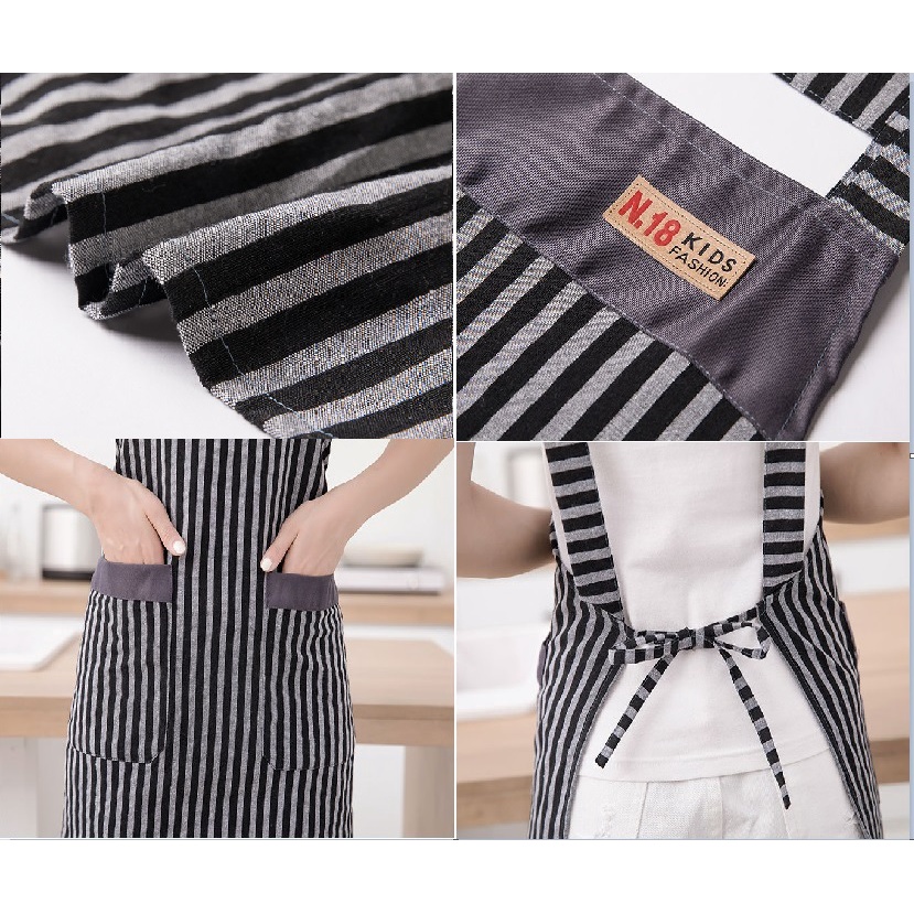 Tạp dề vải kẻ sọc dài phong cách nhẹ nhàng dáng váyTạp dề được sử dụng trong nấu ăn, làm bánh, phục vụ để tránh các giọt bắn dầu, nước hoặc các vết bẩn lên quần áo trong quá trình nấu nướng. Khi chọn tạp dề khách hàng nên chọn loại có độ che phủ tốt, thoải mái khi mặc, chất liệu bền và dễ làm sạch.