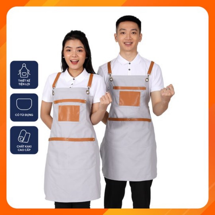✔️ Thiết kế: Tạp dề yếm phối da chính hiệu, phối túi và khuy/khóa chất liệu đồng nổi bật tạo nên sự sang trọng cho tạp dề.