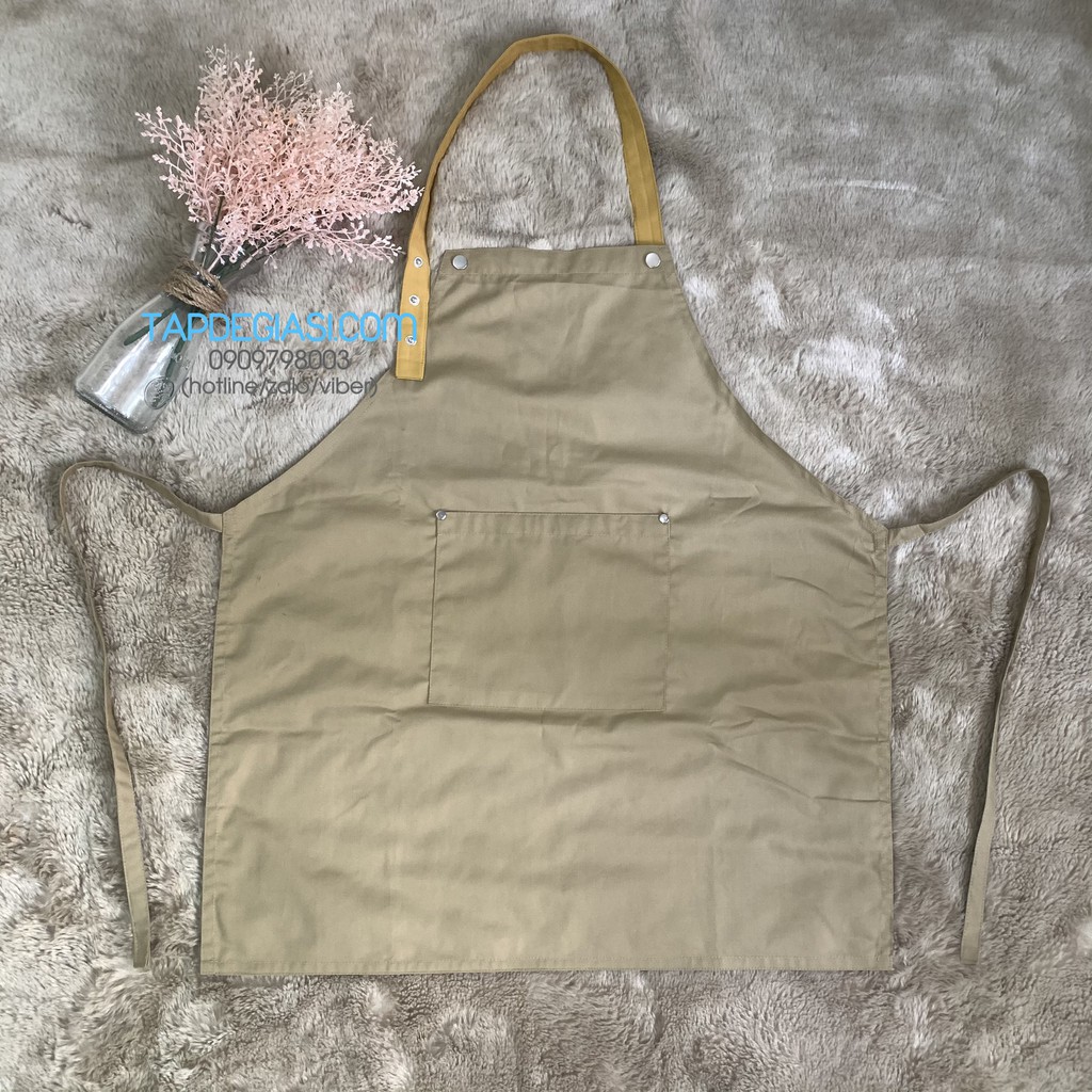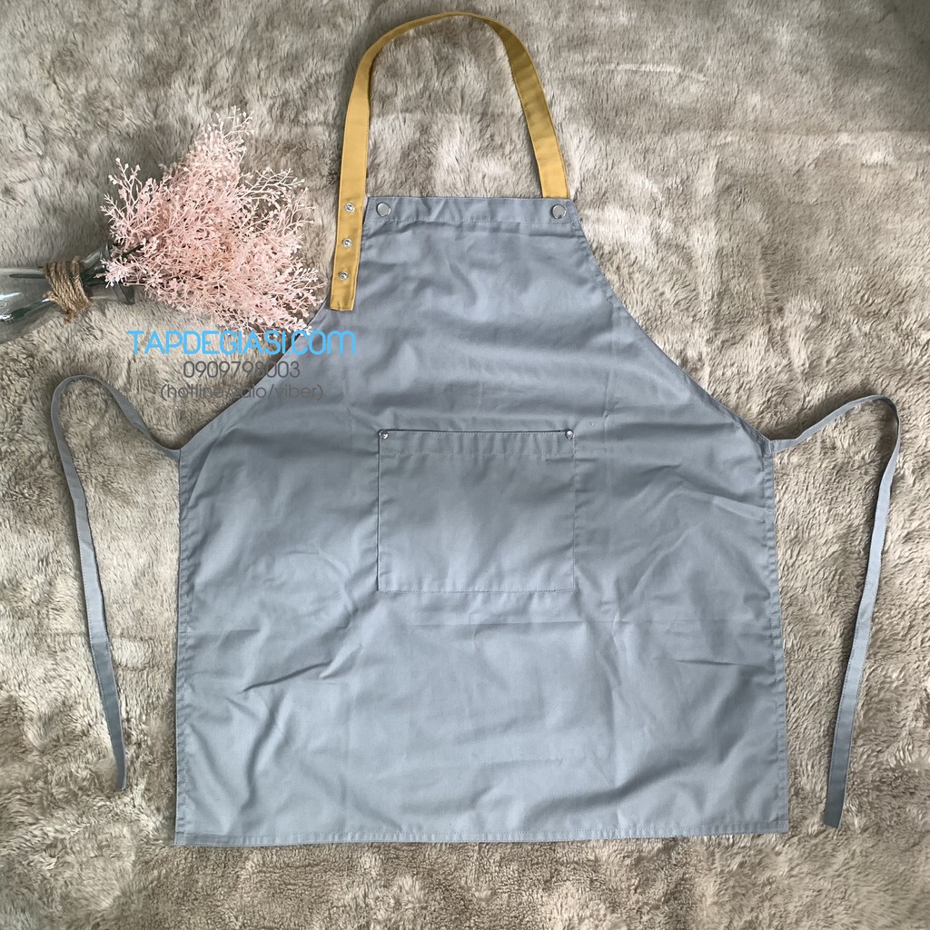 Tạp dề yếm trơn chưa in logo, dây đeo cổ có thiết kế theo phong cách mới với 3 nút bấm có thể tăng giảm độ dài