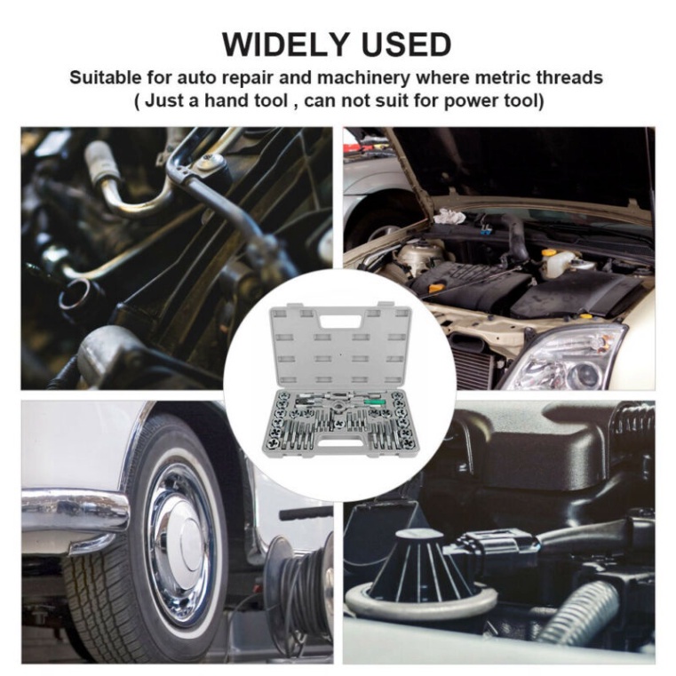 • Một bộ 40 chi tiết gồm:M3*0.5, M3*0.6, M4*0.7, M4*0.75, M5*0.8, M5*0.9, M6*1.0, M6*0.75, M7*1.0, M7*0.75, M8*1.25, M8*1.0, M10*1.5, M10*1.25, M12*1.25, M12*1.75, M12*1.5, 1/8NPT