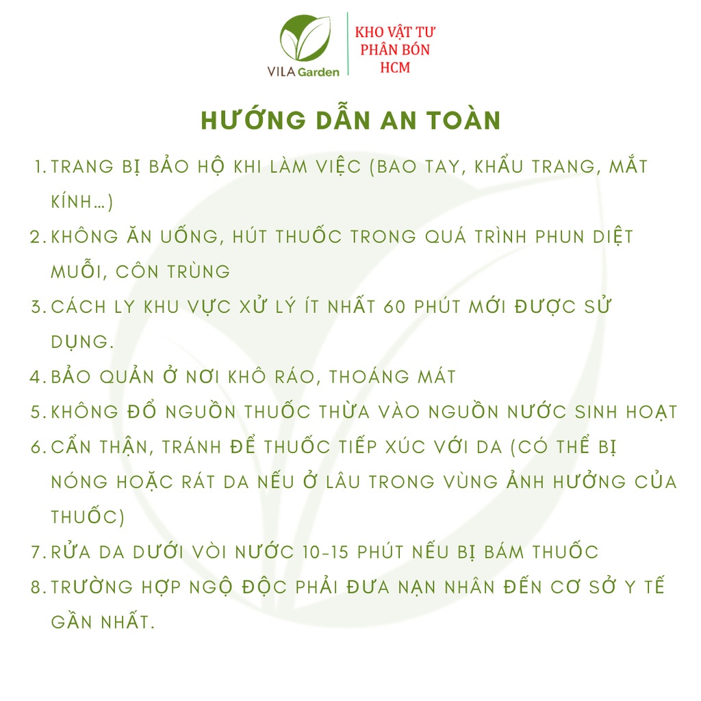 Liều dùng: pha 1 gói 5gr cho bình 8 lít, phun lúc sáng sớm hoặc chiều mát.