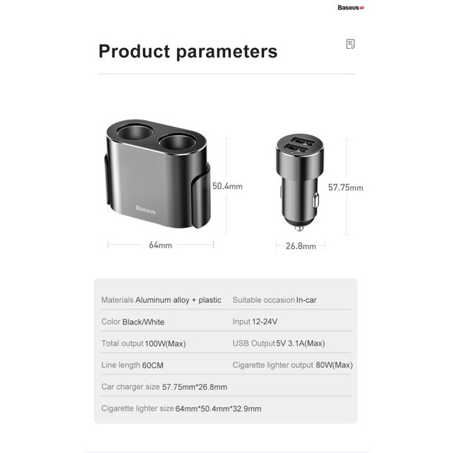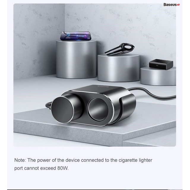 Tích hợp độ chia, có thể gắn cùng lúc thêm 2 tẩu sạc (tổng gắn được 3 tẩu) .Dây cáp 60cm, dùng cho cả ghế trước và sau trên ô tô